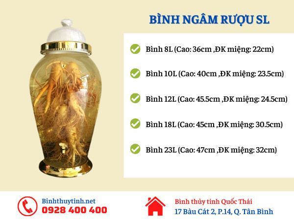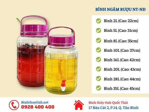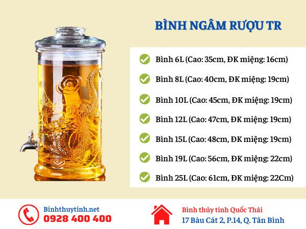 Bình thủy tinh ngâm rượu Việt Nam rất phổ biến và được ưa chuộng, do mẫu mã đẹp, hàng chất lượng, phí giao hàng rẻ. Cửa hàng An Quốc Thái bán các loại bình ngâm rượu Việt Nam như: Bình thủy tinh nắp tím, bình trụ rồng, bình thủy tinh kim cương, giao hàng TP HCM, Hà Nội, Đà Nẵng,....