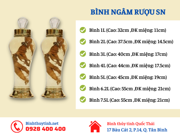Chúng tôi có các loại bình thủy tinh ngâm rượu Việt Nam, Hàn Quốc, bình nắp tím, bình kim cương, bình ngâm sâm, bình ngâm đinh lăng, bình trụ ngâm rượu hình rồng. Hãy cùng chúng tôi xem hình ảnh và giá bán từng loại nhé.